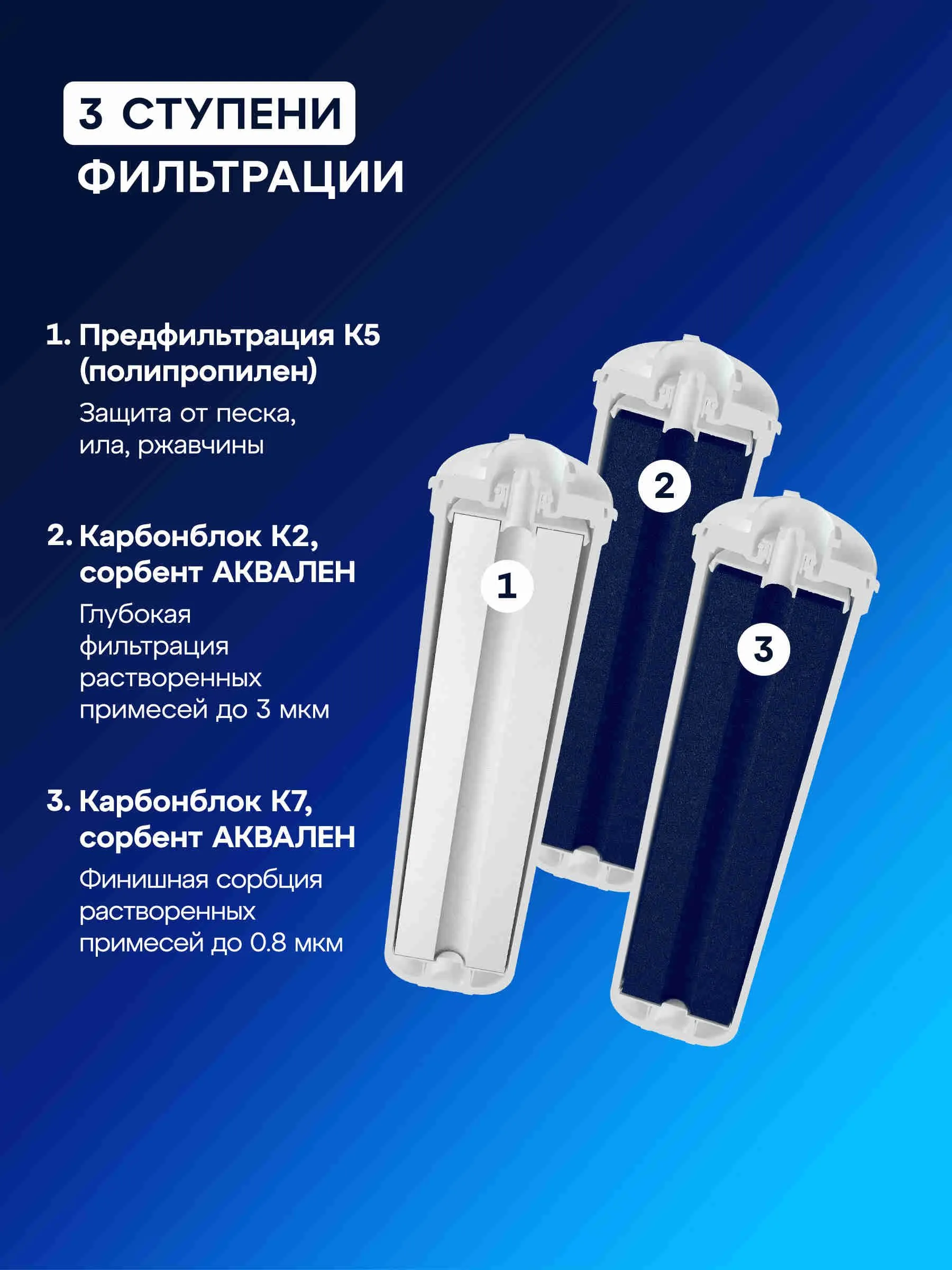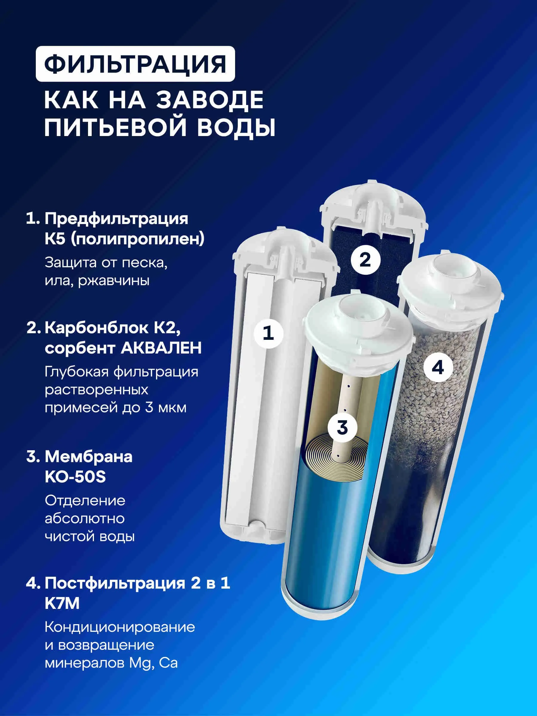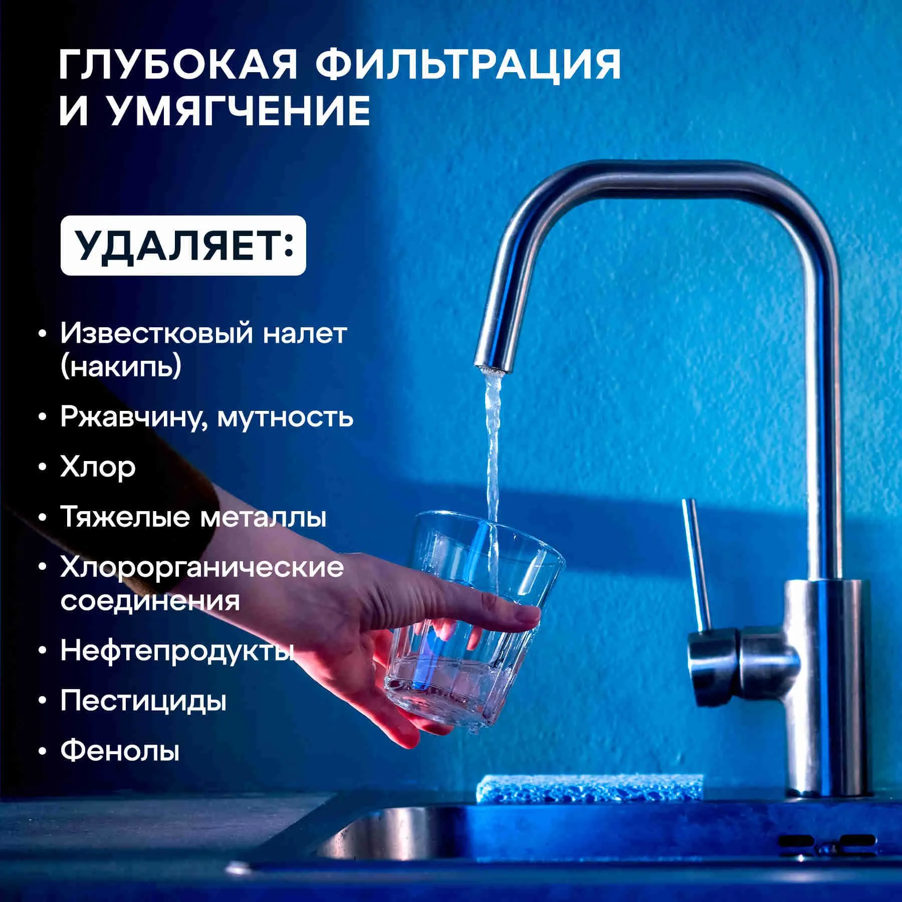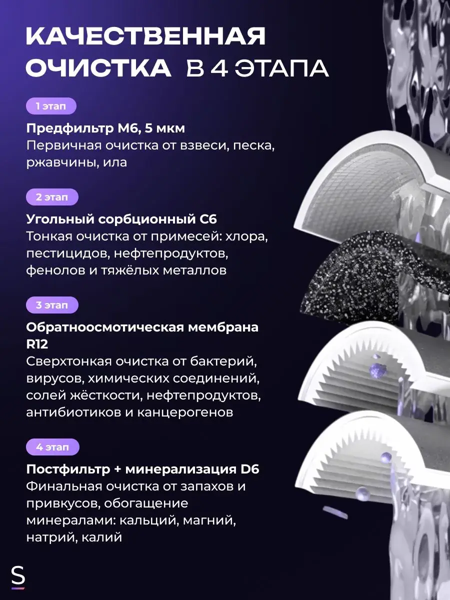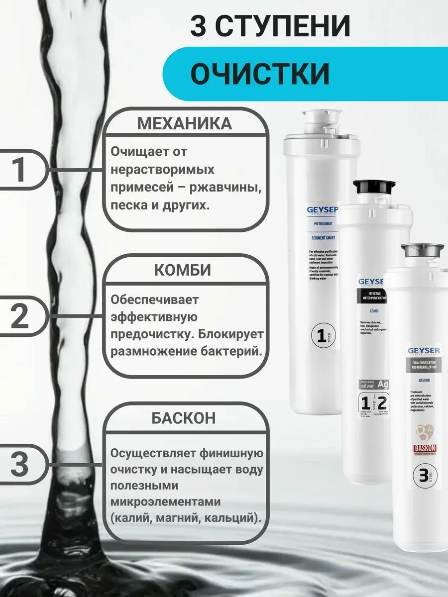 Грубая очистка, Очистка и минерализация воды, Удаление бактерий, Удаление хлора, Смягчение воды, Тонкая очистка, Удаление железа, Понижение окисляемости, Удаление аммония, Удаление марганца, Удаление сероводорода, Насыщение воды кальцием, Насыщение воды магнием, Удаление механических загрязнений, Удаление органических веществ, Устранение привкусов и запахов